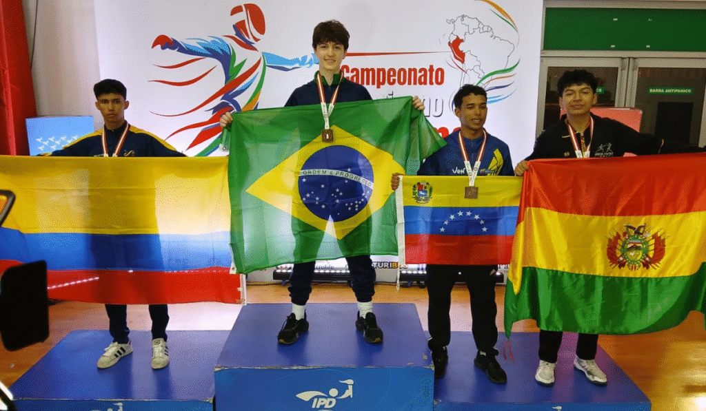 O Brasil fechou a quinta-feira (25) no topo do pódio no Campeonato Sul-Americano de Esgrima Cadete e Juvenil, disputado em Lima, no Peru. Na útlima categoria do dia, o brasileiro Marcus Pinto conquistou o ouro no sabre masculino Juvenil, seu terceiro título na competição. Este também foi o 27º pódio da delegação nacional no campeonato.